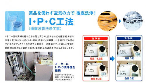 1年に一度は清掃を行う排水管と異なり、飲み水などを運ぶ給水管の洗浄は気づきにくいポイント。実は経年により蓄積した水垢でとても汚れているのです。こちらの工法では薬品を一切使用せず、圧縮した空気を断続的に発射して管内を洗浄。衛生的な水道水を使えるようにします。